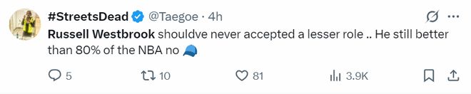 美媒SD:威少本不该接受这样的次要角色,很明显他依旧比NBA中80%的球员都还要强。