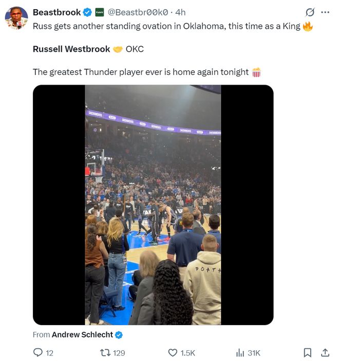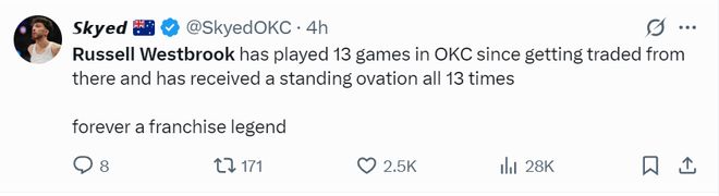雷霆媒体:威少自离开雷霆以来他每次回到俄克拉荷马都能得到巨大的欢呼声,他是雷霆队史的特许经营品牌。